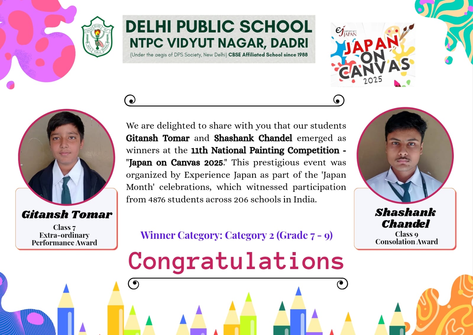 | Heartiest Congratulations to Aaradhya (Class-X) and Rudraksh (Class -VIII) from DPS NTPC Vidyut Nagar for their outstanding achievement in successfully | View |